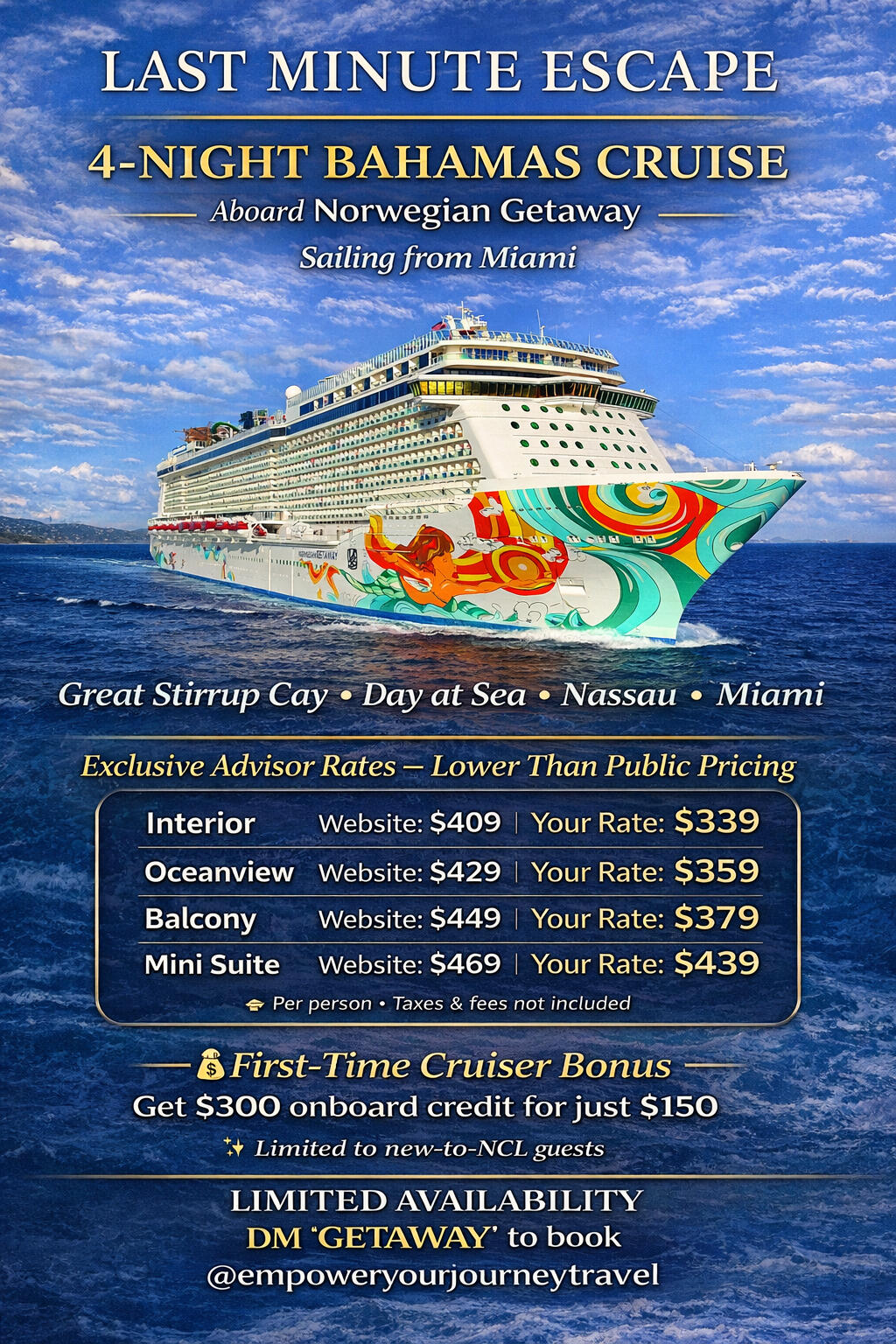 4-night Bahamas sailing aboard Norwegian Getaway. Multiple April departure dates available. Exclusive advisor rates, lower than what you'll find on NCL.com