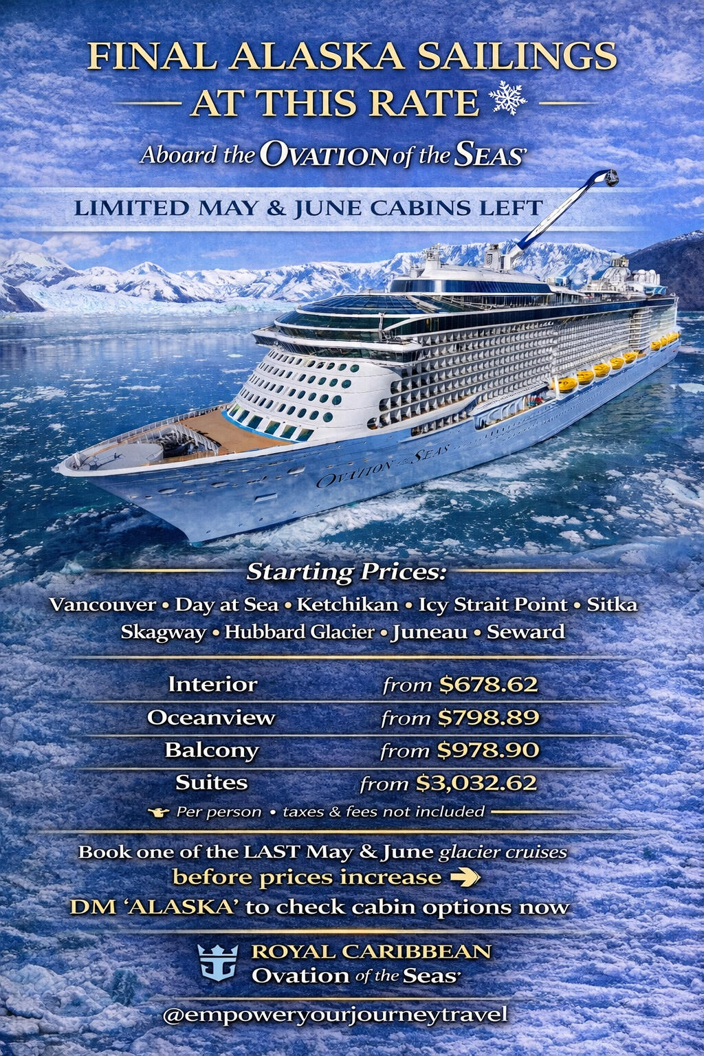 7-night Alaska sailing aboard Ovation of the Seas. Limited May & June departures remaining. Exclusive advisor rates. Book now before rates increase.