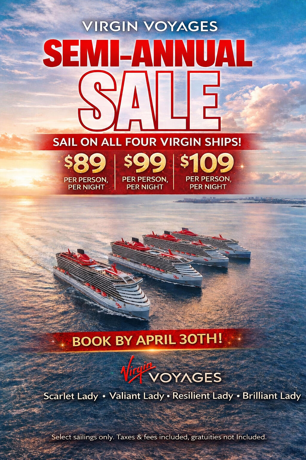 Sun, sea, and the Mediterranean starting at just $89 per person, per night. Sail the French Riviera, Italian coastline, Greek islands and more aboard Virgin Voyages. Ends 4/30